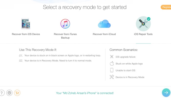 If your device is broken or stuck on Black Screen or Apple Logo, you must select iOS Repair Tools option on the home screen of the PhoneRescue tool and press the Next Button. This tool also let you recover data from iTunes BackUp and iCloud.