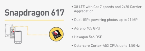Snapdragon 617 supports X8 LTE Modem with Cat 7 download speed that could provide downloading speed of up to 300 Mbps, and up to 100 Mbps uploading speed. It is based on ARM Cortex A53 architecture, and supports Quick Charge 3.0. It is also an octa-core chip that can reach the clock speed of up to 1.5GHz, and would be combined with Adreno 405 GPU and Hexagon 546 DSP. Its Dual-ISPs powering chip can support up to 21-megapixels Photos. Smartphones with this chip wold arrive by the end of this year.