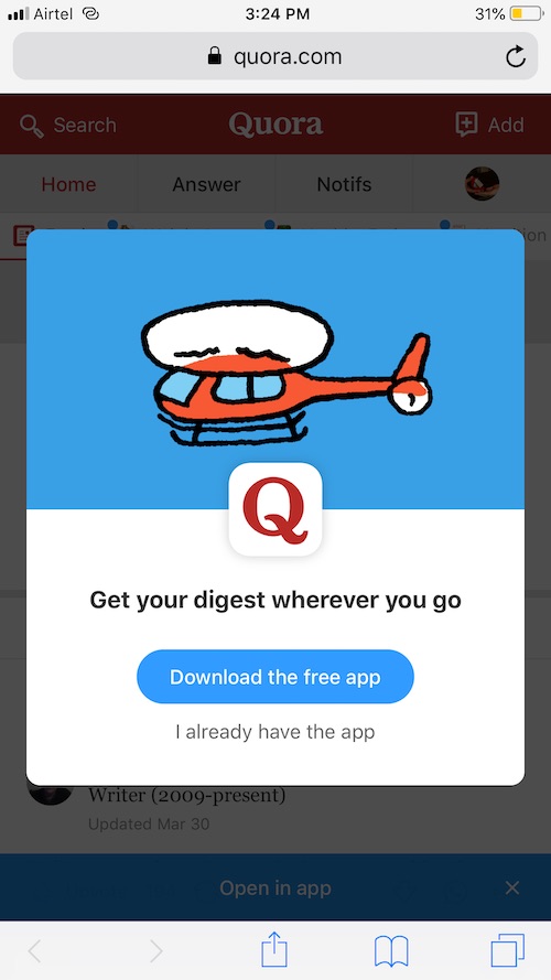 Dear Quora, there are thousands of websites to gain information. If you are forcing readers to download your app to read articles, they would better look for other options. These days most of the smartphone users already have devices flooded with apps that even gets harder to locate. So let’s stop forcing people to use the app when they can use the website within the internet browser.