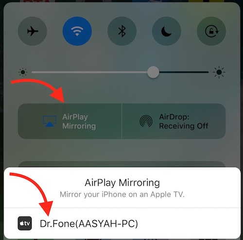 - On your iPhone, swipe up (from bottom) on the screen to access shortcuts. Tap on AirPlay Mirroring option, and select Dr.Fone.