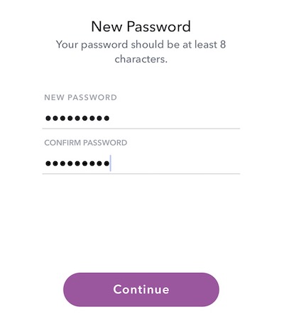 - Now type a Password for your Snapchat account in both the field; New Password and Confirm Password, and hit Continue option. You have done it successfully.