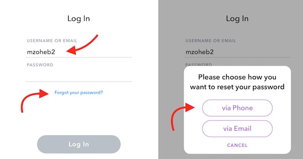 - Enter your Snapchat User ID or Email ID, and tap on Forgot Your Password option. Then Select whether you want to get verified via Phone number or Email. I will select Phone in this tutorial.