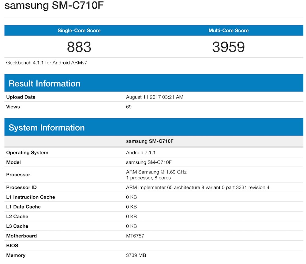 The CPU, RAM, and OS information were leaked via Geekbench as well when Galaxy C7 2017 Model SM-C710F went through benchmarking process. It scored 883 in single-core performance and 3959 in multi-core. This is what you can expect from MediaTek Helio P20 CPU. MediaTek’s CPUs are usually used to decrease the cost of the manufacture and making the device available at a lower price. So let’s see how Samsung is going to price Galaxy C7 with a MediaTek Chip inside it.