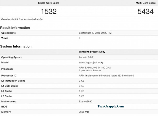 Samsung Lucky Project is running on Android Lollipop 5.0.2, and features 1.5 GHz Octa-core Exynos 8890 SoC and 3GB RAM. It went through Geekbench 3 performance test on 12 September. It scored 1532 in single-core performance and 5434 in multi-core performance.