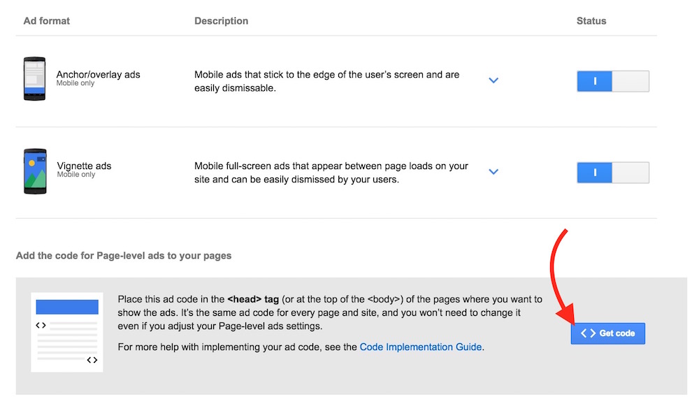 - You will get the get code option at the same place where you enabled page-level ads. Click on Get Code, and copy the ad tag
