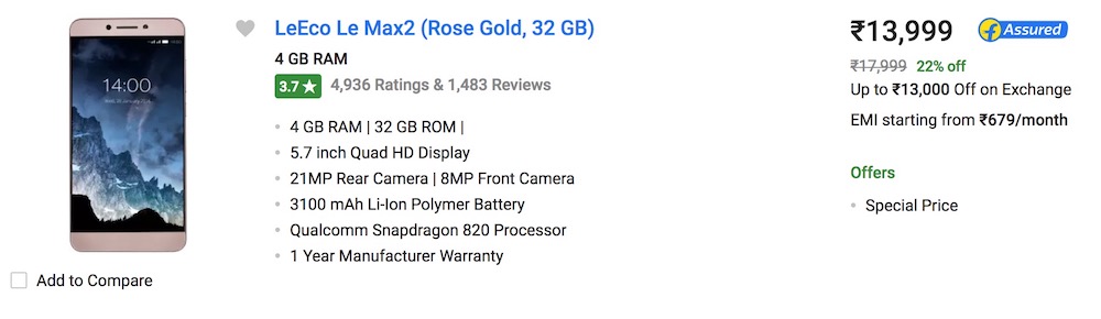 - Buy LeEco Le Max 2 + DSLR: 13,999 + 23,499 = 37, 498 Rs.