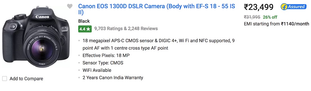 Canon EOS 1300D DSLR Camera is available for 23,499 RS only on Flipkart. So let me give you a calculation…