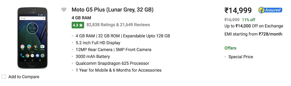 - Buy Moto G5 Plus + DSLR: 14,999 + 23,4999 = 38, 498 Rs