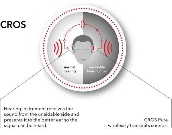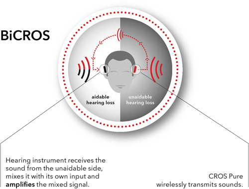 Of course, a binaural solution only work if you have hearing loss that can be reasonably improved by wearing hearing aids in both ears. That’s not always the case, as some people have uncorrectable hearing loss (or are totally deaf) in one ear. But even if you have unaidable hearing loss on one side, primax technology can help through use of a CROS/BiCROS wireless solution. For those who have normal hearing in one ear but cannot hear well (or at all) out of the other, a CROS Pure® device is worn on the unaidable ear and its microphones receive sounds coming from that side. It then processes these sounds for directionality and transmits them wirelessly to the hearing aid worn in the normal-hearing ear to be heard and understood, without adding amplification. Meanwhile, those who have unaidable hearing loss in one ear and hearing loss that responds to a hearing aid in the other, the BiCROS solution similarly transmits sounds from the unaidable side into the functioning hearing aid, which mixes them with sounds coming from its side, producing a suitably amplified and clarified signal that is then heard in the aidable ear.