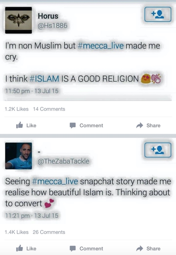 Snapchat added Mecca Live that is quite interesting. Tweeter is flooded with #Mecca_Live tweets. Some of non-muslims are so much interested and has converted or want to convert to Islam. Some of the users mentioned that Snapchat’s Mecca live melted their heart and they saw the true face of Islam.