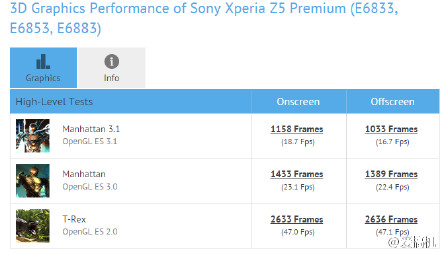 Sony Xperia Z5 Premium has gone through 3D graphic performance test via Manhattan 3.1, Manhattan and T-Rex, and result is quite surprising.