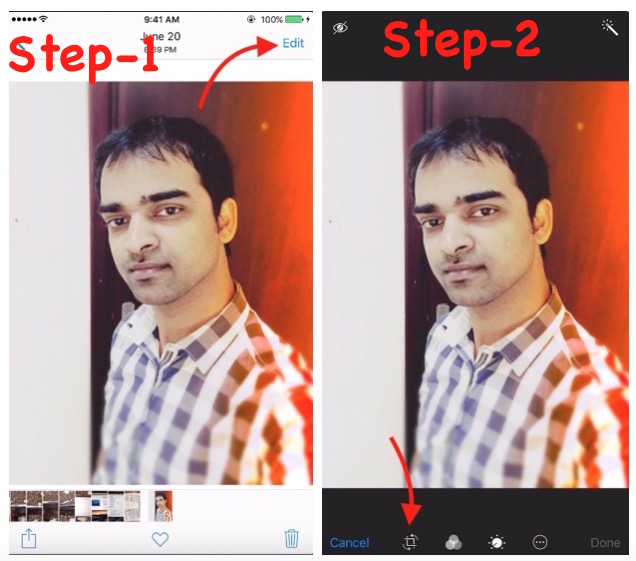 - Launch Photos app on your device, and tap on any photo that you want to square