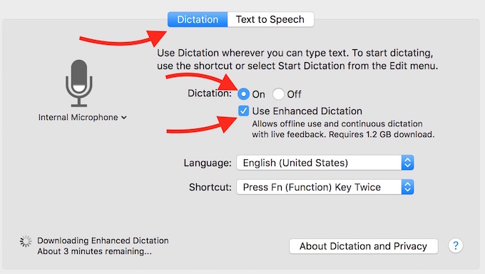 - The first thing you need to do is enable dictation on Mac (also known as Voice to Text feature. You must check the option “Use Enhanced Dictation,” and it will download 1.2 GB file. Wait for the download completion
