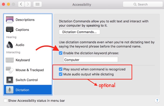 - All the dictation commands are located under Dictation Commands option. Hit the option to enable/disable commands