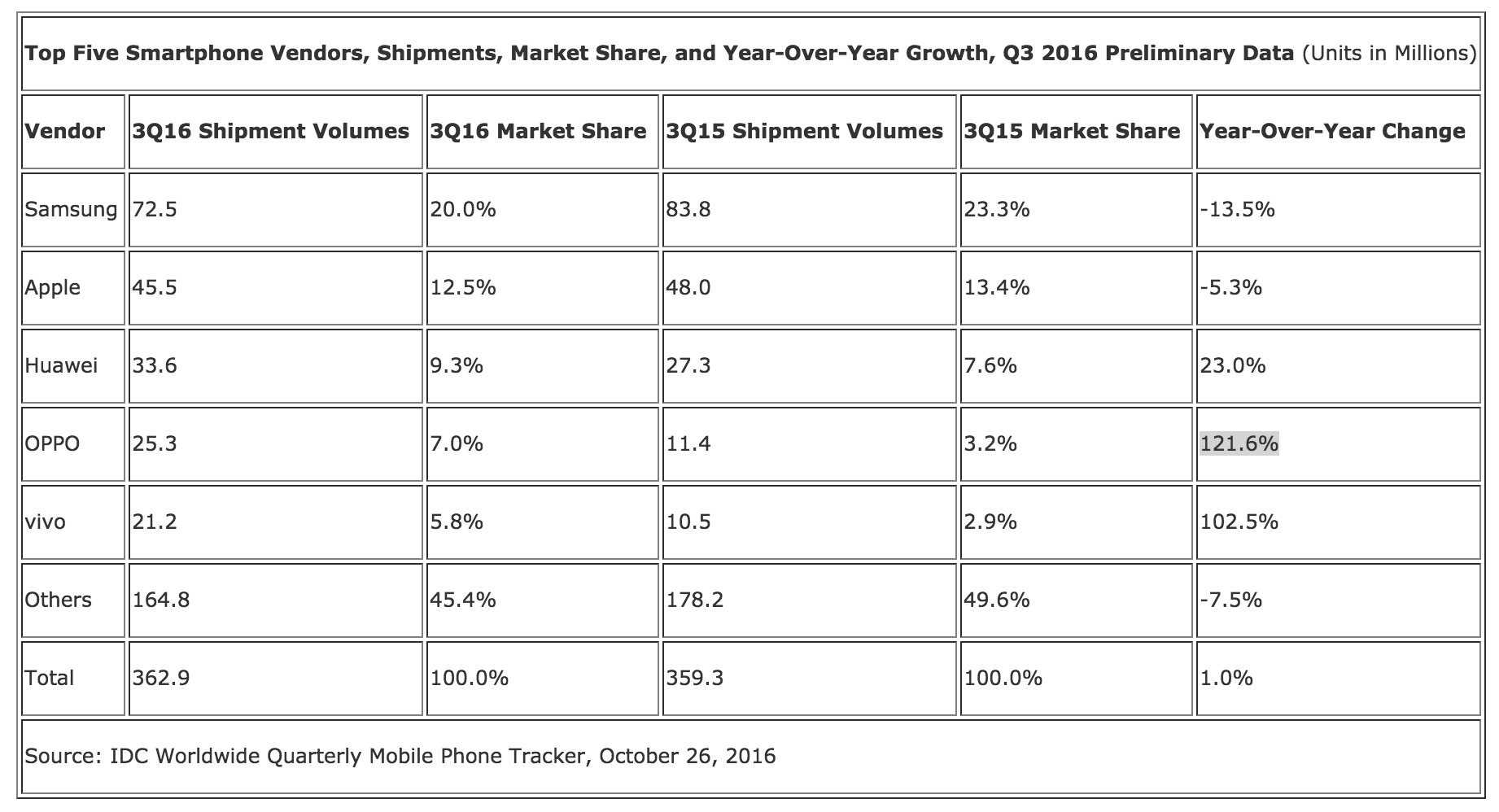 Now the report for Top Global Smartphone Vendors has been released for Q3 2016. These are the top 5 Smartphone manufacturers and their market Share.