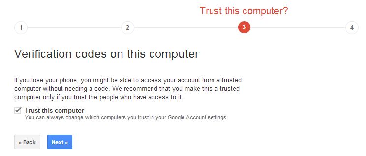 Note: Read the notification before you press next, because the computer you are using is selected as trusted computer by default, and when you lose access your number, this computer might be used to access the account without verifying the code. Here is the screenshot of the notification what you will get.
