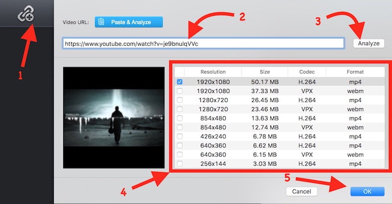 - Now click on the link icon, paste YouTube or any other Online Video URL, and then click on Analyze option. Then select the resolution and format you want to download and click on OK button.