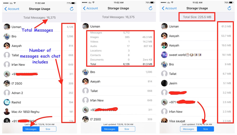 - Instead of seeing number of messages if you just want to see the storage usage, you can simply select Size tab (located on the bottom). Now you will be able to see Total Storage usage by WhatsApp messenger app, and also the storage usage by each chat contacts