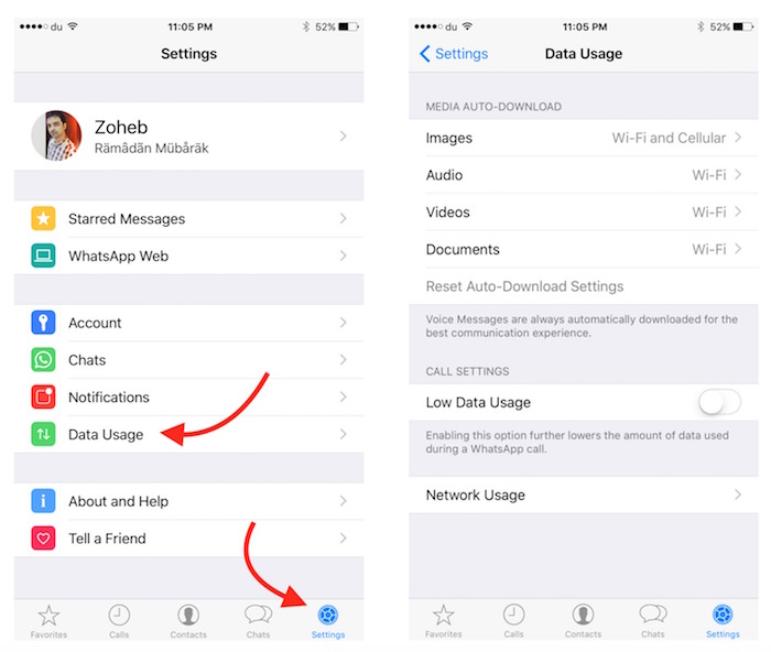 WhatsApp allows to manage data usage while on cellular network. You can prevent videos, images and audio from automatic download. To manage Data Usage on WhatsApp, go to its Settings, and tap Data Usage.