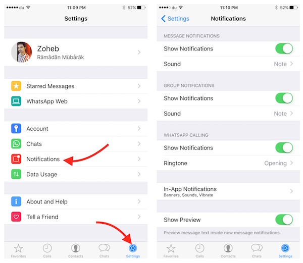 Launch WhatsApp application, Go to its Settings, tap Notifications. Now you can enable/disable sound and notification from here. You can also tap In-App Notifications, to manage sound and notification while using app.