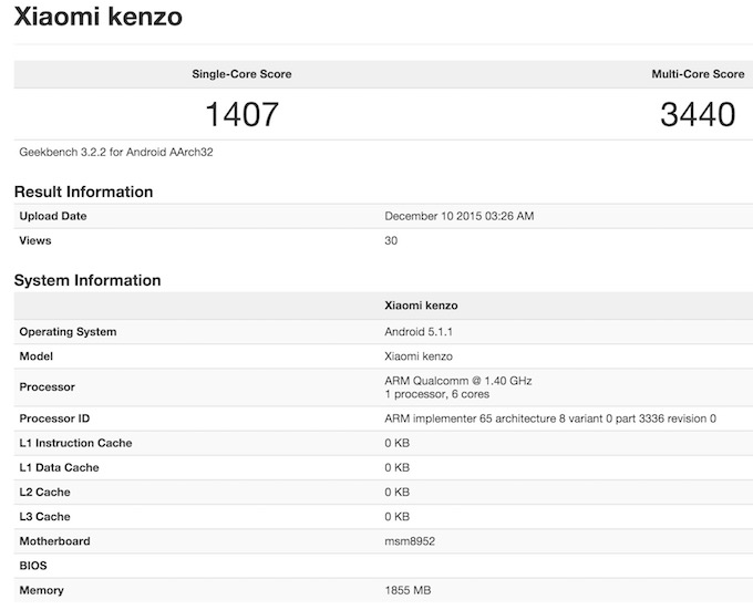 Xiaomi is testing a model with code named as Kenzo. Xiaomi Kenzo GeekBench 3 benchmark report shows it with MSM8952 CPU, 2GB of RAM and the device is running Android Lollipop 5.1.1. In the bench mark test, Redmi 3 / Xiaomi Kenzo scored 3440 in multi-core performance and 1407 in single-core.