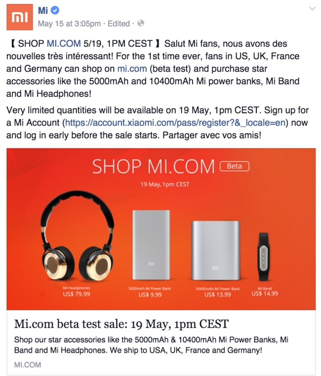 Xiaomi’s post on Facebook describes that they are doing a beta test for the first time to make Xiaomi’s accessories available in the US, UK, France and Germany. Xiaomi has already put the accessories on its online store mentioning the price that includes: 10400 mAh Mi Power Bank for $ 13.99, 5000 mAh Power bank for $ 9.99, Mi Band for $ 14.99, Mi Headphone for $ 79.99. Here is the screenshot of their Facebook Post;