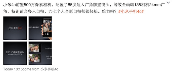 Lin Bin has confirmed that Xiaomi Mi 4c will feature a 5-megapixel front shooter, and we already knew that. However, he explains how great the front camera is. Mi 4c will feature a 85-degree super wide angel front facing 5 MP camera, equivalent to 24mm wide angle camera. It will also have self timer option, and can cover 6-7 people in one shot.
