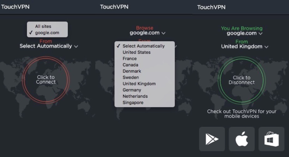 Touch VPN extension for Google Chrome is free to use, and it allows to connect to the United States, France, Canada, Denmark, Sweden, United Kingdom, Germany, Netherlands and Singapore. You can either allow the Touch VPN to choose a location automatically, or select any location manually. They do ask to share them on social media, but only once when you change to a different location. Touch VPN allows to connect and use VPN for all websites, or for a certain website.